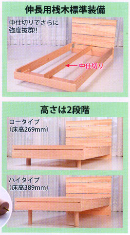 天然木無垢材による丈夫な作りです。やや幅広になっていますから、掛ふとんの落下を防ぐことが出来ます。高さは足を組み替えることにより、6段階に調節出来ます。足腰が弱くなっても大丈夫です。年齢に応じて高さが変えられます。若い人はロータイプのベッドとしても楽しめますよ。
